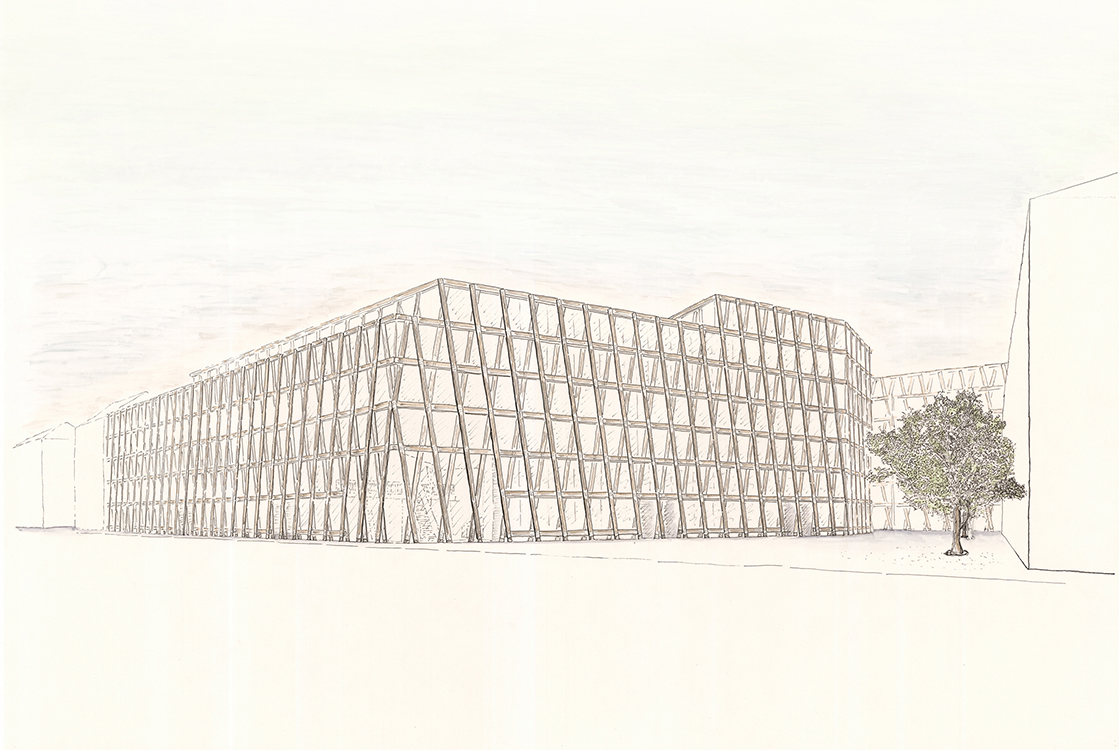 Eine Struktur aus querverleimten Brettschichtholzträgern wird vor Ort zu einem Gerüst aus Diagonalen und Horizontalen verschraubt und aufgerichtet. Querbalken sowie diagonal verlaufende Stützen im Inneren schliessen die Haupt-Tragstruktur ab. Das Stützensystem erlaubt einen flexiblen Innenausbau - die Struktur kann gänzlich neue Grundrisse mit einem alternativen Wohnungsmix oder wahlweise einem vollständig neuen Raumprogramm aufnehmen. Auch eine vollständige Demontage sowie Wiederaufbau mit unterschiedlichen Gebäudehöhen und Formen ist möglich.