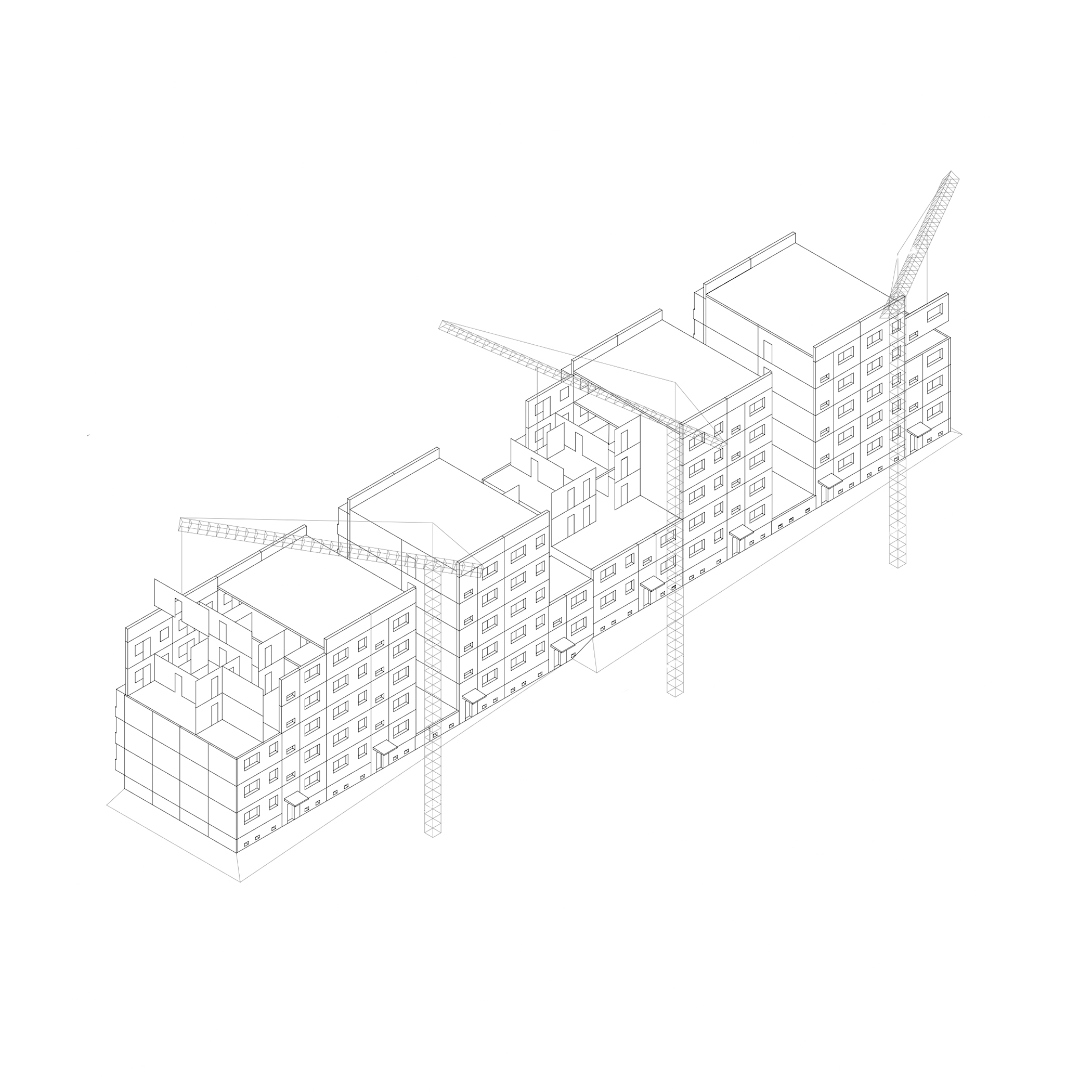 Der Bestand bleibt soweit wie möglich erhalten und wird nur von oben zurückgebaut. Die dadurch entstehenden Dachflächen werden zu Gärten. Mehrere kleinere Wohnungen werden über jeweils zwei Stockwerke zu Häusern zusammengelegt. Die Maßnahmen folgen der konstruktiven Logik des seriellen, gefügten Plattenbaus. Bestehende Öffnungen in den Platten, sowie alle Treppenhäuser bleiben erhalten und werden nur teilweise ergänzt. In KG, EG und 1. OG befinden sich 8 Reihenhäuser mit privaten Gärten im Hof. Die Raumhöhe der gartenseitigen Wohnräume erstreckt sich über zwei Geschosse mit einer lichten Raumhöhe von über 5 m. Durch zwei offene, vertikale Straßen mit neuem Fahrstuhl und offenerTreppe erreicht man die oberen Häuser. Über Vorgärten betritt man die Gebäude. Die Gärten mit überdachter Terrasse liegen hinter den Häusern auf den Dächern der Reihenhäuser. Den oberen Abschluss im 4. OG bilden vier weitere Einfamilienhäuser mit Gärten auf den Dächern.